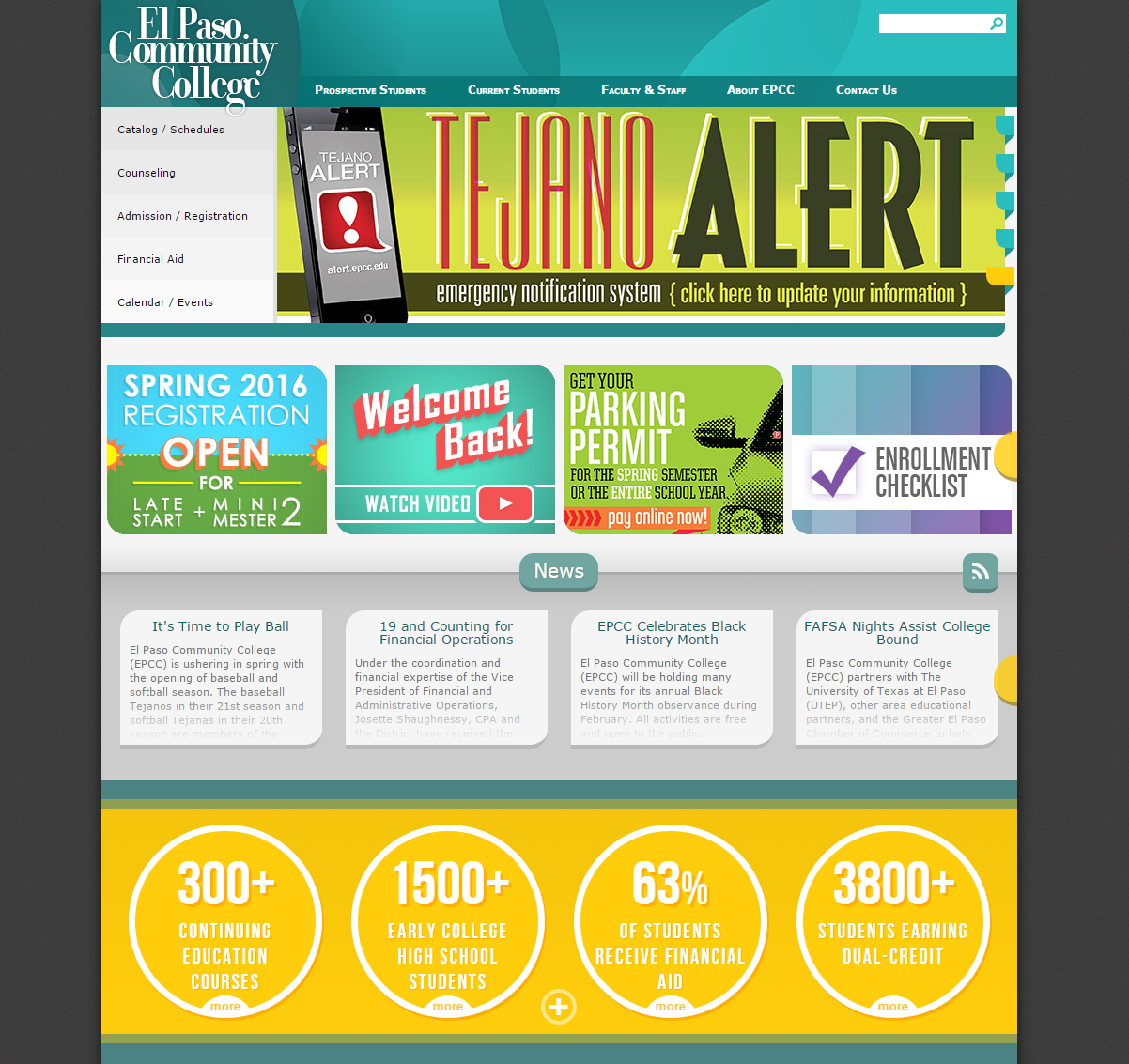 Early on during my time at El Paso Community College, I created and implemented an updated design for the school’s public-facing homepage. This update included a total rework of the website’s main navigation as well.